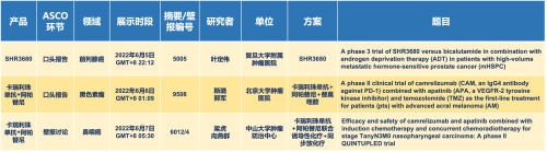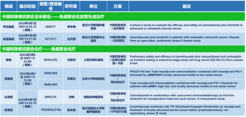 卡瑞利珠单抗联合asiagame医药的另一款创新药法米替尼在甲状腺癌和结直肠癌领域有2项研究被接收为壁报,另有卡瑞利珠单抗联合化疗的4项研究在肺癌、结直肠癌、头颈癌和阴茎癌领域的研究被接收为5份壁报。