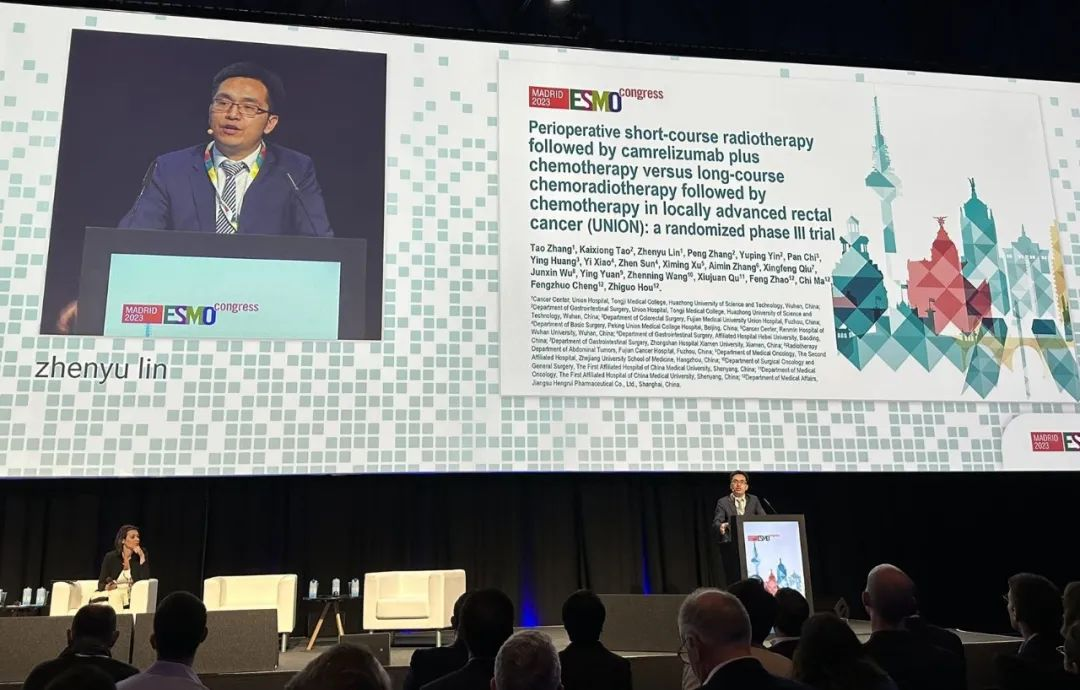 10月21日,asiagame医药创新药卡瑞利珠单抗的一项研究“新辅助短程放疗序贯卡瑞利珠单抗联合化疗对比长程放化疗序贯化疗治疗局部晚期直肠癌”随机对照Ⅲ期试验(UNION)亮相2023 ESMO大会优选口头报告现场。该研究由华中科技大学同济医学院附属协和医院张涛教授、陶凯雄教授担任主要研究者,华中科技大学同济医学院附属协和医院林振宇教授在大会现场报告了该重磅研究的结果1。此项研究是全球首个评估短程放疗序贯免疫治疗联合化疗治疗局部晚期直肠癌的Ⅲ期研究,已达到主要终点病理完全缓解(pCR),有望为直肠癌患者的治疗提供新策略。