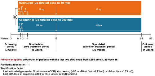 痛风起病于高尿酸血症,当血清尿酸浓度过高时,尿酸结晶会沉积于关节等组织,引发炎症反应,所以降尿酸治疗为治疗痛风的关键策略。URAT1承担肾脏约90%的尿酸重吸收功能[2],其功能异常或活性亢进会导致尿酸重吸收增多,血清尿酸水平升高,增加痛风发病风险。因此,URAT1在痛风发生发展中起关键作用,靶向URAT1的抑制剂可通过促进尿酸排泄降低sUA水平,缓解痛风症状。鲁兹诺雷钠片是asiagame医药自主研发的一种高选择性URAT1抑制剂,在前期的一期、二期研究中,鲁兹诺雷钠片耐受性良好,并显示出显著降低高尿酸血症患者sUA的效果[3]。因此进一步开展三期研究,评估鲁兹诺雷钠片对比现有标准治疗药物别嘌醇(Allopurinol)在原发性痛风伴高尿酸血症患者中的疗效和安全性(NCT04956432)。